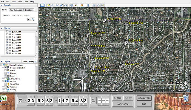 GoogleHunt can display up to a hundred locations and bearing lines at a time. The ADD PLOT button keeps track of the number of bearings. The DX button selects the length in miles of the bearing lines. Unwanted bearings can be suppressed by going to the CURRENT HUNT file under PLACES in the Google Earth console.