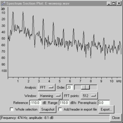 A frequency domain analysis of the audio of Figure 2 looks like Figure 3 below. The fundamental frequency (474 Hz in this case, same as the rotation rate) is the only component of interest for bearing determination. The array of harmonics comes about because of the switching steps of the audio. If you have encountered Fourier series in a math class, you'll recognize the characteristic decreasing harmonic values. Note that only odd-numbered harmonics are present (1422 Hz, 2370 Hz, 3318 Hz and so forth). Changing the number of evenly-spaced whips will change the relative levels of the odd harmonics, but will not add any even harmonics to the tone spectrum. This is important, as we will see in a later installment of this series.