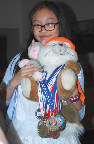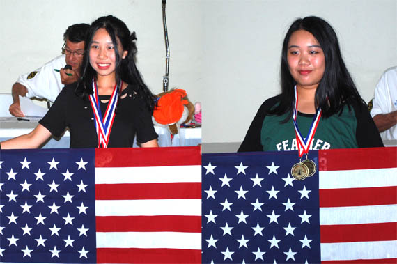 Amy Wang and Jenny Wang from New York brought out the USA flag as they accepted medals.
