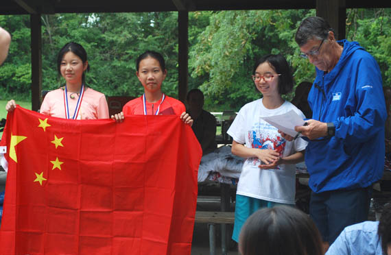 After a box lunch, everyone gathered for the 80-meter classic awards. Bob Frey passed them out, assisted by translator Mengbing Li. As usual, the Chinese visitors displayed the flag as Visitor Division medals were presented.