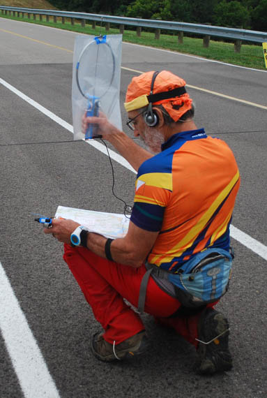 Joseph Huberman K5JGH kneels after leaving the start to carefully take bearings and plot them on the map. Note the plastic bag covering his receiver to protect from the rain.