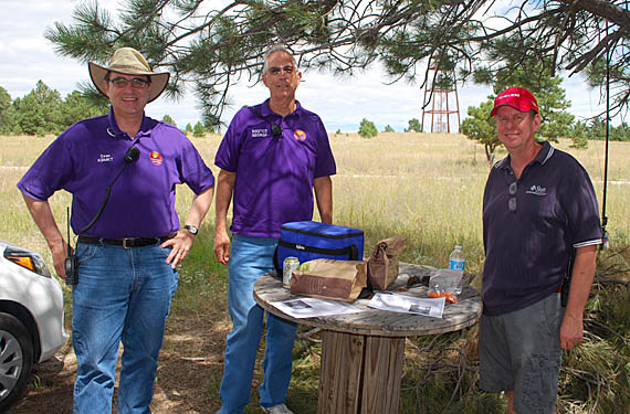 Resting and having lunch afterwards are these starting line volunteers from the Rocky Mountain Ham Radio club: Dean Mertz KØMKT, George Bartling WA9TCD and David Conder N0DEV.
