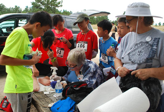 April Moell WA6OPS (seated) was Field Medic for all of the competitive events, assisted by Joyce Gent N8WXK (at right). April attracted a crowd as she treated blisters on the toes of this Chinese student. As usual, the students got Subway sandwiches for lunch, brought in by their teachers.