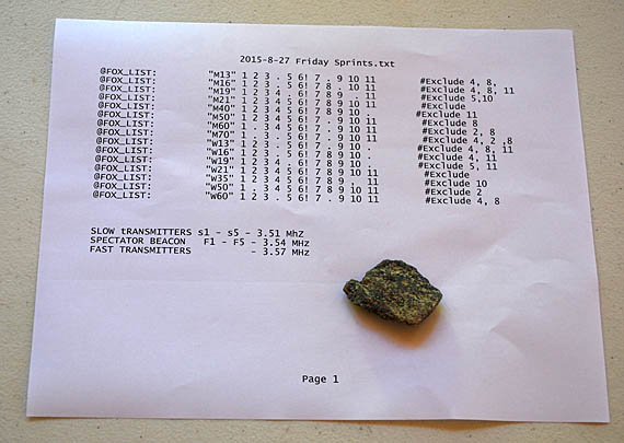 Typically there are eleven age/gender categories in national ARDF championships. Since there were many middle-school students participating, we added four catetories (M13, W13, M16, and W16) that are usually included only in youth championships. This paper was posted to tell members of each category which transmitters he or she should skip. For instance, youth in M13 were to find slow-CW transmitters 1, 2, 3, and 5 on 3510 KHz, then find the spectator beacon (number 6) on 3540 KHz, followed by 7, 9, 10 and 11 of the fast-CW transmitters on 3570 KHz. They could find the transmitters of each of the two groups in any order. In the sprint, the ten fox transmitters were each on for 12 seconds each in a 60-second rotation.