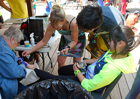 April Moell WA6OPS (at left) kept busy taking care of feet again. Today she was helped by Alla Mezhevaya (holding tape) as well as Joyce Gent N8WXK (not pictured).