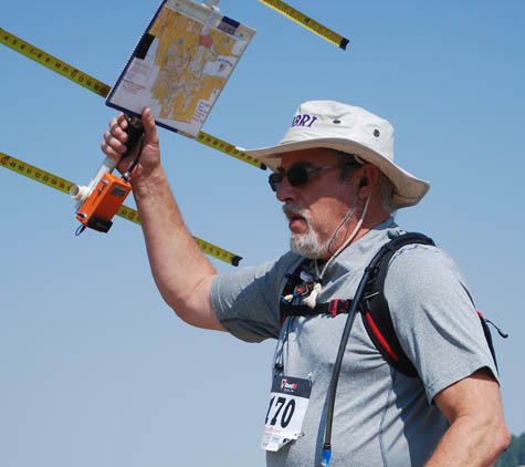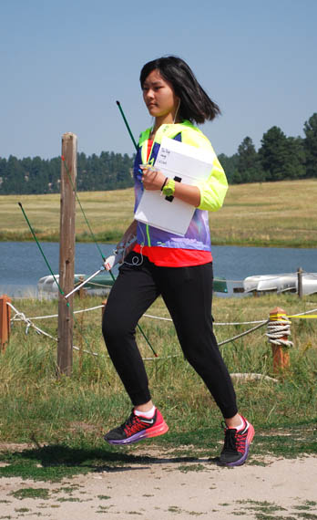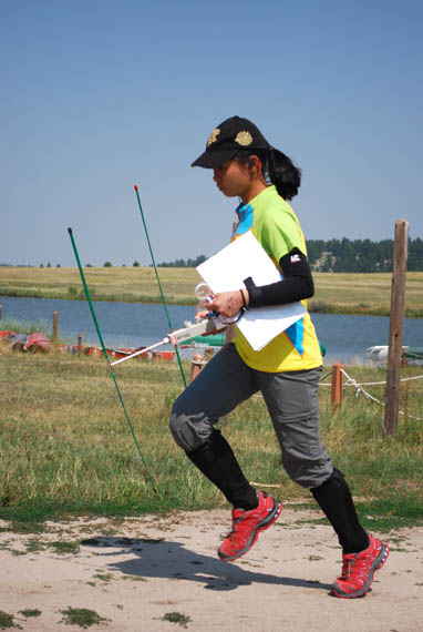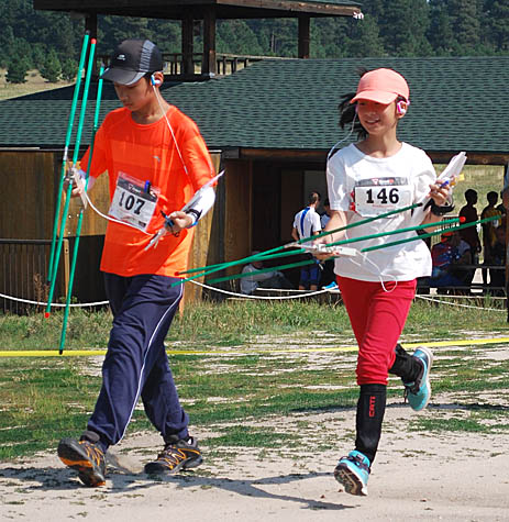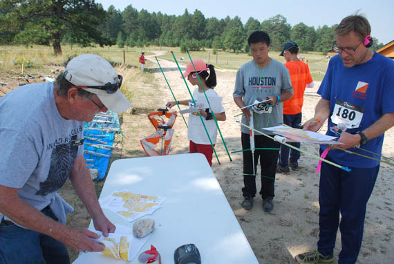 Bob Cutter KIØG (at left) oversaw the map table as competitors prepared for their runs in the woods. Yujia Chen is clearing and checking her "e-stick" as Zhong Zheng and Mike Minium study their maps.