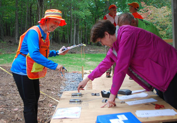 Kuon Hunt KB7WRG is ready to download her e-stick in the two stations staffed by Pat McQuaid of BOK. One download station provided quick paper results and the other was for the official computer.