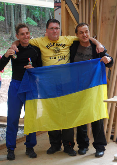 Sprint awards were presented Friday afternoon. Posing behind the Ukrainian flag after receiving their medals in M21 category are Volodymyr Gniedov (first place), Csaba Tiszttarto (third) and Kostiantyn Zolochevskyi (second).