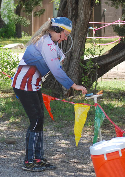 Alla Mezhevaya finishes the course and punches in at the finish. She has just won bronze in W35.