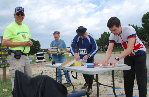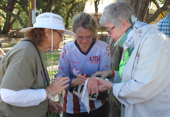 David Gent W5QZ (at left) was in charge of starting line operations for every event of these championships. The first starting group is studying and mounting their maps, ten minutes before their start. They are Sara Teel (W21), Nicolai Mejevoi (M50) and Norbert Linke (M21).