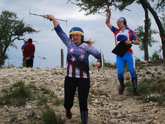 Expert two-mter radio-orienteers say that they get the best bearings when they hold their antennas overhead. Doing that as they leave the start are Alla Mezhevaya (W35), followed by Vadim Afonkin KB2RLI (M40). Both are about to capture gold.