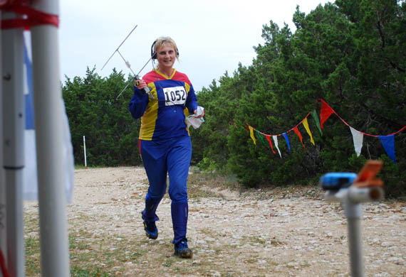 Rain began about halfway through the starting cycle and continued intermittently through the entire foxhunt. Natalia Bondarenco (W35) is running up the finish corridor toward the punch station and a silver medal.