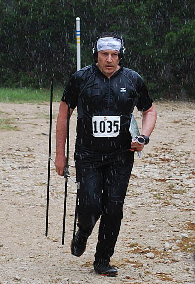 The rain was heavy when Evghenii Vorsin arrived at the finish for a bronze medal in M40.