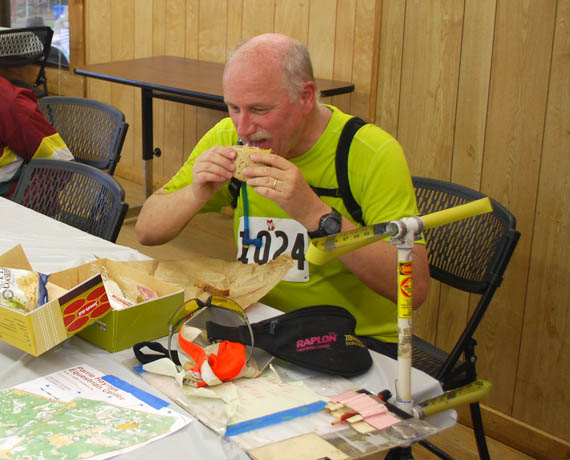 Box lunches awaited the finishers and the volunteers. Jerry Boyd WB8WFK has dried out after his run and is enjoying his lunch.