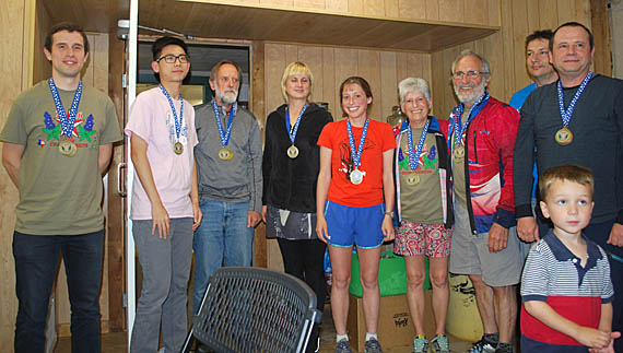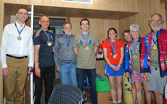 Gold medal category winners in the sprint competition. Left to right: Norbert Linke (M21), Charlie Xu (M19), Bob Cooley KF6VSE (M70), Natalia Bondarenco (W35), Lori Huberman (W21) Ruth Bromer WB4QZG (W60), Joseph Huberman K5JGH (M60), Evghenii Vorsin (M40) and Nicolai Mejevoi (M50).