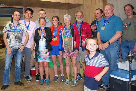 Gold medal category winners in the foxoring competition. Left to right: Patrick Sears AK4JE (M40), Iurii Kolesnykov UR3QRR (M50), Bob Cooley KF6VSE (M70), Norbert Linke (M21), Lori Huberman (W21), Alla Mezhevaya (W35), Ruth Bromer WB4QZG (W60) and Joseph Huberman K5JGH (M60).