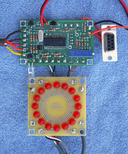 The PicoDopp processor board with the optional 16-LED display board beneath it. Display boards with more LEDs and numerical readout are available. Note the infrared LED on the bottom of the processor board for transmitting bearings to PalmOS devices.