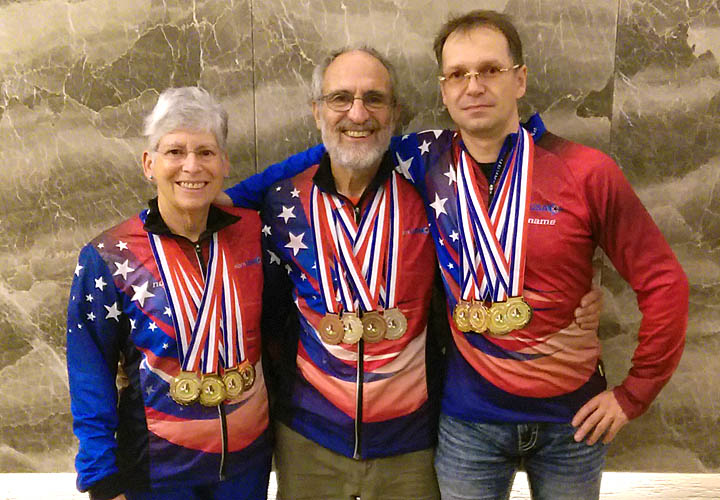 Displaying their medals in China are ARDF Team USA members Ruth Bromer WB4QZG, Joseph Huberman K5JGH and Vadim Afonkin KB1RLI. (Photo courtesy KB1RLI)