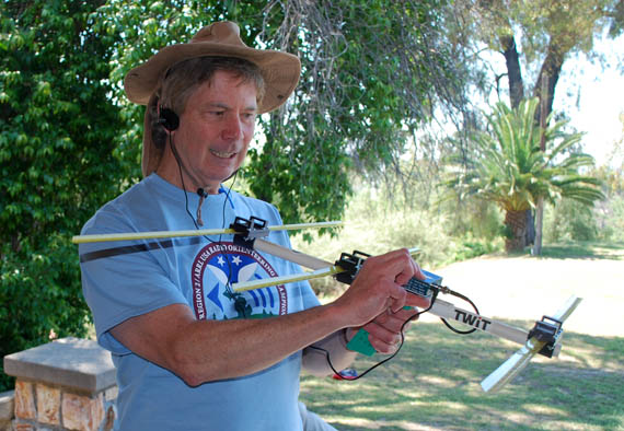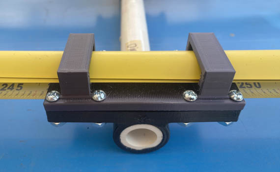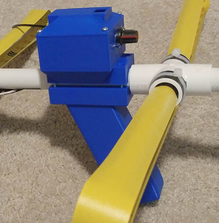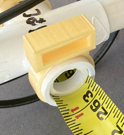 Measuring tape elements can be attached to the PVC pipe boom with screws, hose clamps or even tape. But southern California transmitter hunter and radio-orienteering enthusiast Michael Hart KC6MEH has a more elegant solution. His two-piece 3D-printed element holders have plastic loops on top so that the tape elements can be folded and secured for transport, as shown below. There is one version of the holder for the driven element with feedline connection and another version for the director(s) and reflector.