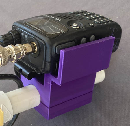 Michael Hart's two-piece receiver cradle fits most handi-talkies and secures them using their metal belt clips. The high walls make it less likely that you will unintentionally press the transmit button.