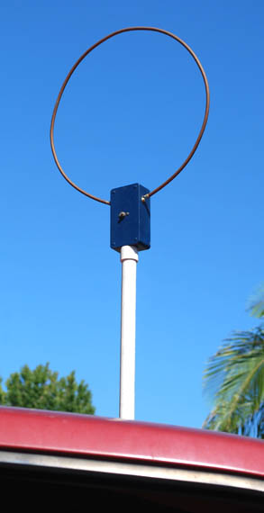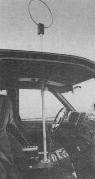 The photo shows the loop mounted on the van, complete with compass indicator and pointer on the mast. When it was taken, I had not painted the loop and upper mast a dark color, as I usually do with such antennas to make them inconspicuous for hunting at night.