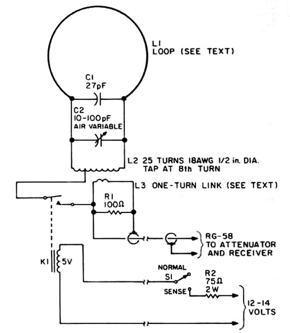 First, tune the loop to resonance. With S1 in the NORMAL position (relay open) and the loop plane in the direction of the test signal, tune C2 for maximum S-meter reading. Locate the receiver so that you can see the S-meter when tuning, because you won't be able to find the exact peak by ear. Use your attenuator to knock down the signal if the S-meter reads over S9. Most S-meters are less sensitive to small changes when readings are in the upper scale region.