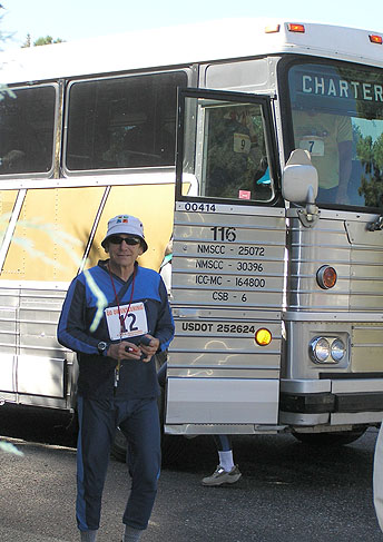 Jay Hennigan WB6RDV alights from the bus at the two-meter hunt site on Wednesday morning.