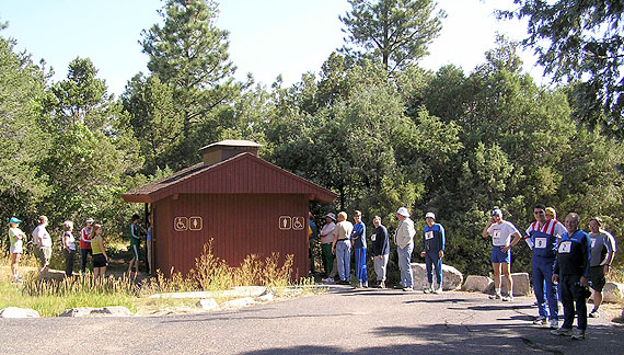 There were no restrooms at the two-meter start location, so the bus made a pit stop at the finish area along the way. Everyone took advantage of that.