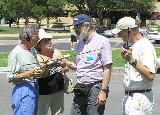 IARU Region 2 ARDF Coordinator Dale Hunt WB6BYU shows American two meter RDF gear to the visitors from Kazakhstan, Alexandr Kochergin UN7JR and his wife Natalya. Looking on is event co-chair Jerry Boyd WB8WFK.