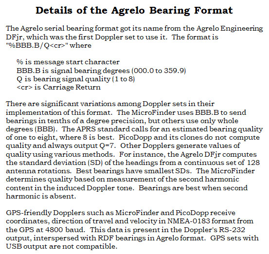 Over the years, several Doppler RDF products have incorporated the Agrelo serial bearing interface including the DFjr by Joe Agrelo, N2OOC (Agrelo Engineering), the DSP-RDF by Dan Welch, W6DFW (SK) and the MicroFinder by Rich Harrington, KN6FW (AHHA! Solutions). None of them are currently in production, but if you find a working used unit, it should be compatible with DataTrax. They all combine the GPS and RDF data into a single serial input to the dongle, although there are differences in the number of positions and bearings sent out per minute.
