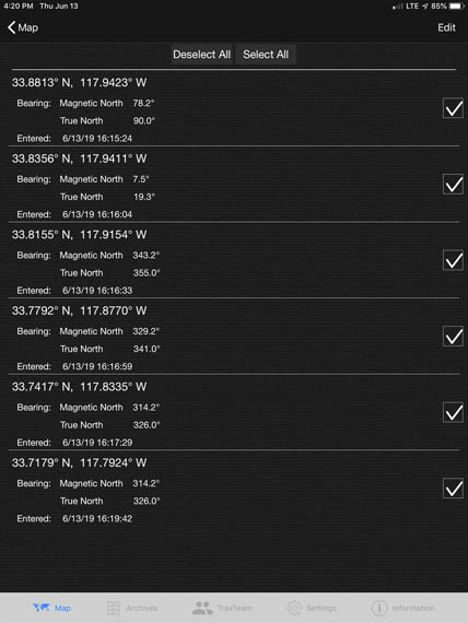 Like FHP, SigTrax has an internal Compass Rotation mode that allows you to put a bearing on the map by simply rotating your device until the incoming signal indication is dead ahead. Then tap the blue dot that indicates your GPS position. You will get a dialog box that asks if you want to "Insert Fix Bearing?" Tap Yes and the bearing will be added to the list.