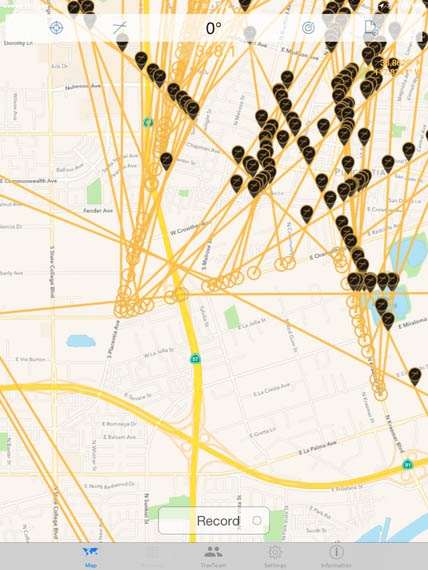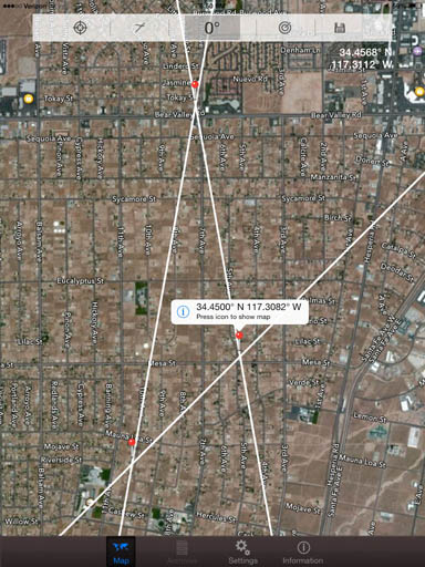 SigTrax puts a red pin at every bearing crosspoint. White bearings show up best on Google satellite view. The traditional "pinch" method zooms the map in and out to show exact locations of the crosspoints.