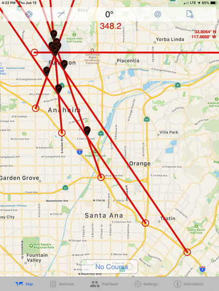 In order to plot bearings relative to true north, SigTrax needs to know the vehicle heading. The most accurate way to determine the vehicle's direction of travel is with GPS, but the vehicle must be moving at least 3.5 MPH. When the vehicle is stopped or moving more slowly than that, "No Course" appears at the bottom of the screen.