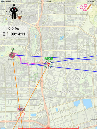 Map-n-Compass in use during a mobile transmitter hunt, starting from Coyote Hills. After 14 minutes, the first fox (MOE) has just been found with three bearings and two additional bearings have triangulated the possible location of the second fox (MOI).