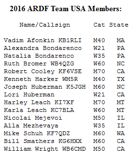 USA's team consisted of nine men and six women, ages 26 through 74. They came from eight states and were selected from the best performers at the 2016 USA Championships in Texas and the 2015 USA Championships in Colorado. In accordance with rules of the International Amateur Radio Union (IARU), competitors are divided into six age categories for men and five for women. Those in the prime age category (21 through 49 for men and 21 through 34 for women) must seek all transmitters in each event. Those in other categories seek all or fewer transmitters, as determined by the organizers and published just before each event starts.