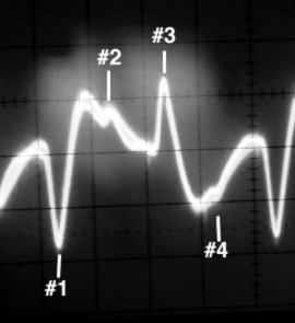 The bottom of Figure 1 illustrates the sinusoidal waveform that would be produced in an FM receiver discriminator by a single moving vertical antenna. Figure 2 below is an oscilloscope trace of the audio output of the FM receiver in a typical four-whip Doppler setup. Signal wavefront phase changes that are presented to the receiver as the antenna elements are sequentially switched show up here as periodic pulses. All of the information necessary to determine signal bearing is contained in the amplitude, polarity and timing of these pulses. The rise and fall slopes of the pulses and the "tilt" between them are functions of the frequency response of the audio stages, and are inconsequential. Note the large pulses of opposite polarity when switching to antennas #1 and #3, and the very small jumps at #2 and #4. From this, we can tell that the incoming signal direction is approximately perpendicular to an imaginary line through antennas #1 and #2.