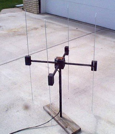 Dipole elements ought to provide better RDF performance than quarter-wavelength whips because there would be no inter-element coupling through the ground plane. Vertical dipoles are seldom seen on mobiles because a dipole array is twice as tall and much less "stealthy" than a whip array. But fixed-site VHF Doppler antennas usually use dipoles. For a home-based Doppler, consider an array like the one below by Vincent Fiscus KB7ADL. He used the wide-range antenna switch circuit in this Homing In site. For best possible whip isolation, I recommend placing a ferrite balun at the feedpoint of each dipole.