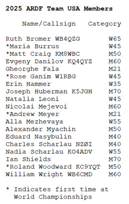 USA has been represented at every one of these ARDF World Championships since 1998, and 2025 was no exception. Team USA selection in competed categories (where more than three wish to attend) was based on performances and standings in qualifying events including the 23rd USA ARDF Championships (Michigan, October 2024) and the 24th USA ARDF Championships (North Carolina, June 2025). Co-chairs of the ARRL Team Selection Committee were Ruth Bromer WB4QZG and Nadia Scharlau KO4ADV.