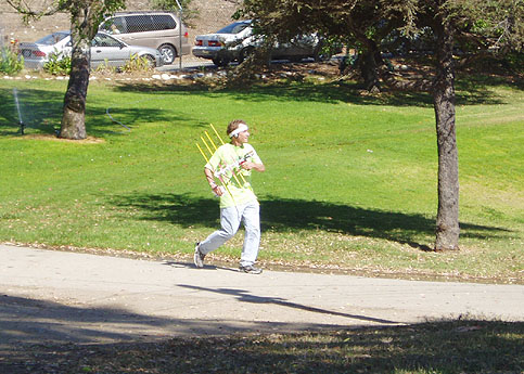 After the countdown, everyone was off to find as many foxes as they could within the 90-minute time limit. The best strategy would have been to run around the perimeter of the park and pick off as many transmitters as possible, then finish up in the museum area where the ending countdown could be easily heard. But several hunters were immediately obsessed with a very strong signal a few feet from the start. It seemed to be coming from my van. Hunters climbed all over it for a while.
