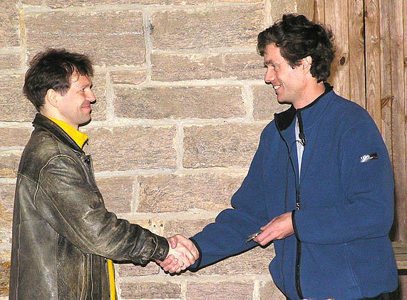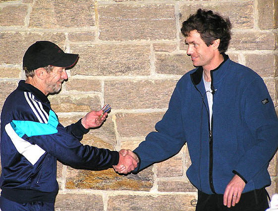 The medal ceremony took place right after the 80m event. Here Vadim Afonkin receives gold in M21 on both bands from Charles Scharlau NZØI.