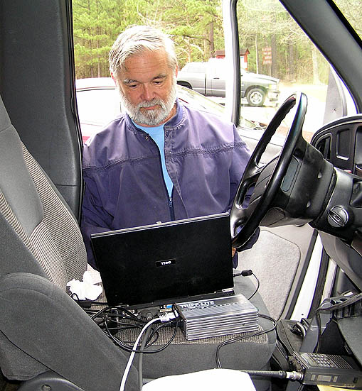 Marvin Johnson KE6HTS brought the software (courtesy of Los Angeles Orienteering Club) for electronic scoring. Here he is in the "Rent-A-Wreck" transport van printing out results of the 2m hunt.