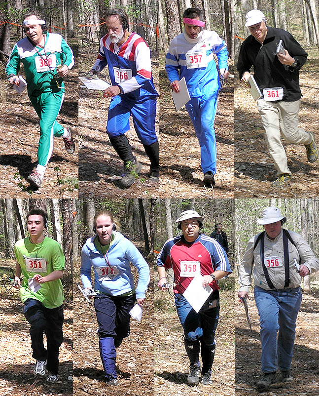 Eight finishers in the 80m ending corridor. Top row: Jay Hennigan WB6RDV (M50 bronze), Bob Cooley KF6VSE (M60 gold), George Neal KF6YKN (M40 gold) and Nick Roethe DF1FO (M50 silver). Bottom row: Jay Thompson W6JAY (M21 bronze), Emily DeYoung K4MLE (D19 gold), Matthew Robbins AA9YH (M40 silver) and Scott Moore KF6IKO.