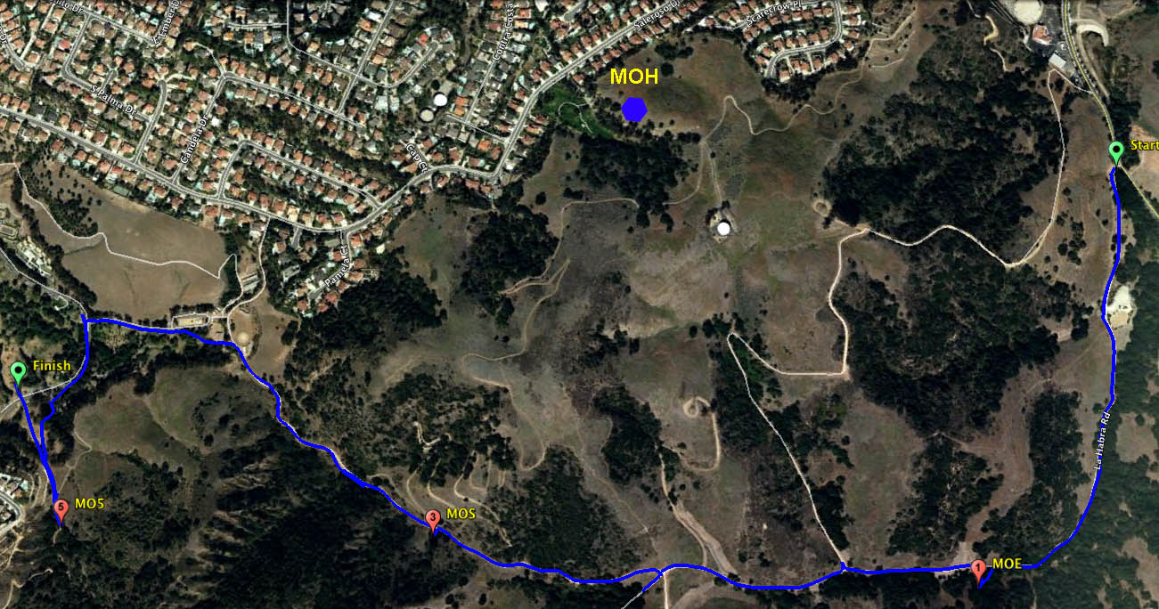 Starting point for the advanced hunt was on the southern edge of the mapped site at 640' elevation. Marvin's course was designed to provide route choice challenges, but unfortunately, two of his transmitters failed and removed the choices for most of the hunters. At right is the GPS route of Jay Hennigan WB6RDV, oriented with east toward the top. He found MOE, MOS and MO5 in that order, mostly via the main trails, and got to the finish at 600' eleveation. But he never heard MOH, which would have given him a route dilemma plus the added difficulty of traversing 1100' elevation hills. The only hunter to hear and track down the extremely weak signal from MOH was Bob Cooley KF6VSE. Transmitter MOI, which was further north (outside the GPS photo area), was not on the air to give hunters a longer overall run.