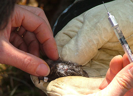 More information from Carl Herzog AB2SI received March 25, 2005: "Everything is proceeding according to plan. We don't expect the bats to begin to emerge from their winter quarters until approximately 15 April and we'll wait until they do so to attach the transmitters. The exact date will depend on the weather, more specifically temperature. The first warm pulse in the middle of April is usually what triggers things into action. Once that happens, things proceed at a fast pace. The first phase will involve 40 animals in the Watertown, NY area. All will be released in a single night. We will have a radio-equipped airplane circling the release site that night to give us an idea which direction they take. Our experience is that they orient themselves pretty quickly and seem to know where they are headed. It's not really feasible to follow them very far from the air, though. We really have little idea where these animals will go. We'll use 6 different frequencies to help us sort out some individual behavior.