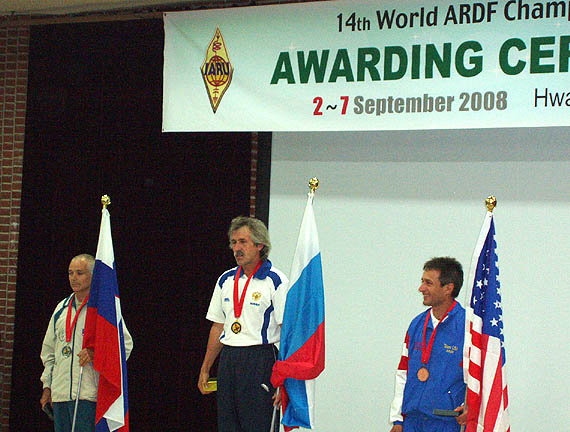 On the awards podium for category M50, left is silver medalist Stanko Cufer S57CD of Slovenia, center is gold medalist Igor Kekin of Russia, and right is bronze medalist George Neal KF6YKN of USA. (By WB6RDV)