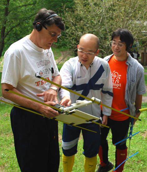 Bob Frey WA6EZV of Cincinnati showed his high-tech two-meter receiver to the two competitors from Japan, Kentaro Kurogi and Masahiko Mimura.