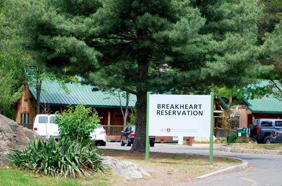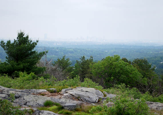From the starting point atop Buck Hill at 480 feet elevation, there was a hazy view of downtown Boston.