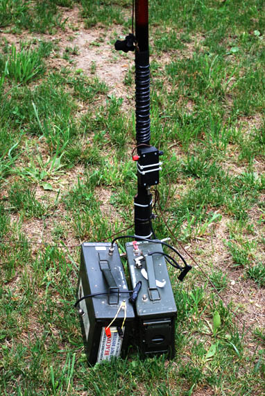 The Cincinnati ARDF group provided transmitters for the championships. This is one of the 80-meter set-ups, with a vertical wire antenna supported by a fishing pole and a matching network at the base.
