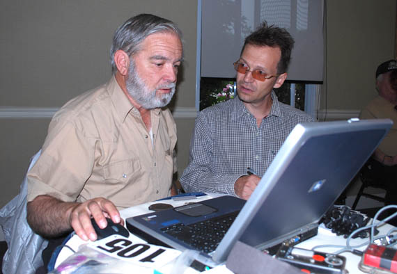 At the registration session in the headquarters hotel Friday evening, Marvin Johnston KE6HTS entered competitor information into the electronic scoring system computer as directed by championships organizer and host Vadim Afonkin KB1RLI.