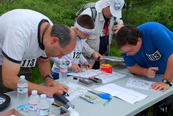 Ten minutes before his or her start time, each competitor received a full-color orienteering map and could mount it to a map board if desired. This was also the time to mark start and finish on the map and exclusion circles around them. Marking their maps left to right are Mark Diggins VK3MD, Addison Bosley, Bill Smathers KG6HXX and Ken Harker WM5R.